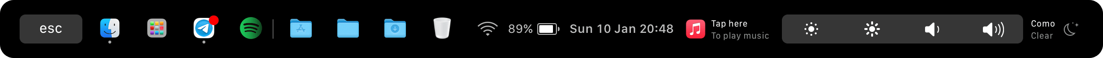 Having said that, I came across a very interesting project a few weeks ago called Pock that lets you put the Dock into the touch bar. This combined with "permanently" hiding the Dock makes the touch bar more useful for me. If I'm honest, it's just to see if I have a Slack notification, but that alone is worth it.
